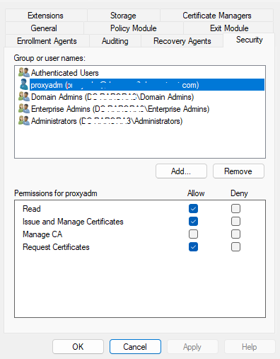 The CA configuration gives permissions to the domain user account to issue and manage certificates and request certificates.