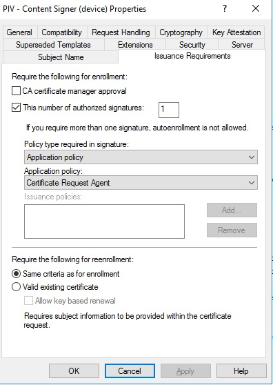 Click OK to close the Properties dialog box. The PIV - PIV Content Signer certificate template is added to the list of templates.
