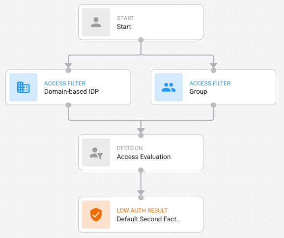 Access Filter nodes (Groups, Domain-based IDP, Access Context Reference) must connect to start and the Access Evaluation node. Access filters are optional.