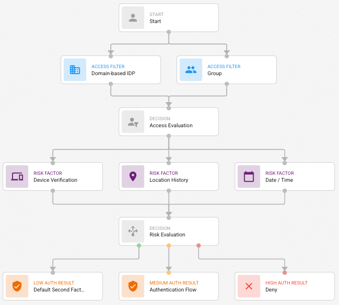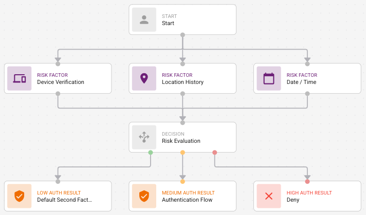 The Risk Evaluation node has three handles and can have three outgoing edges that represent the low, medium, and high authentication flows.